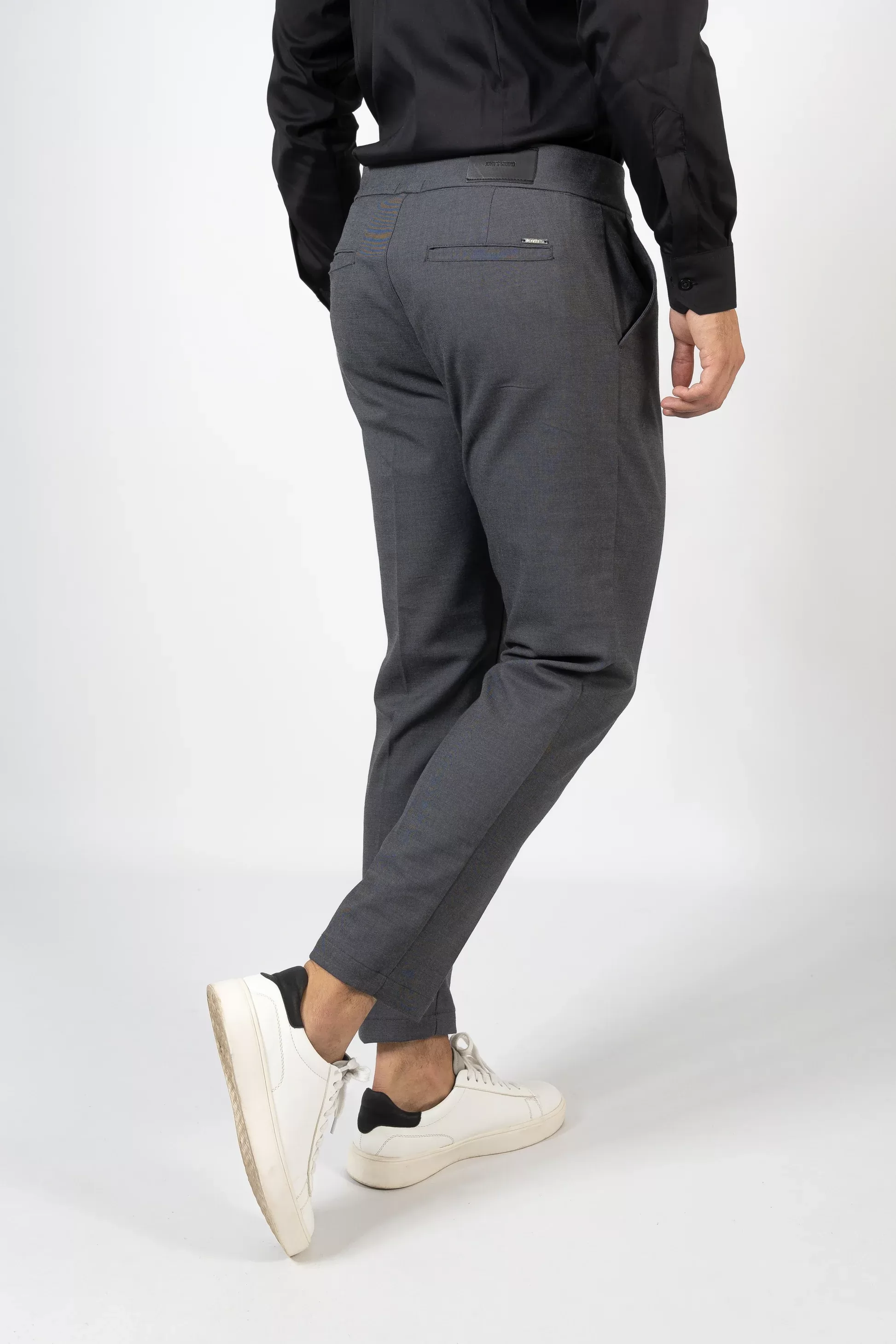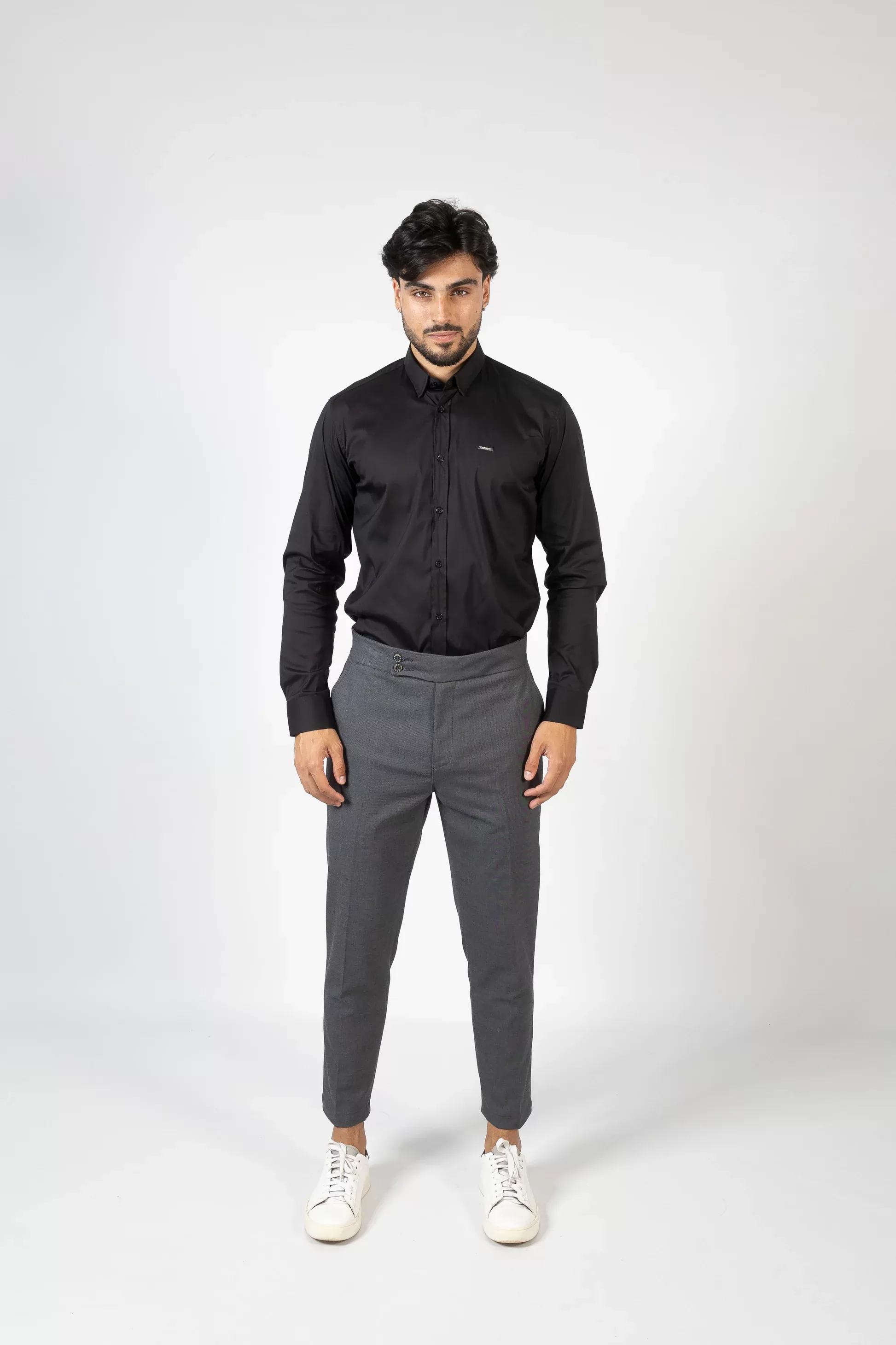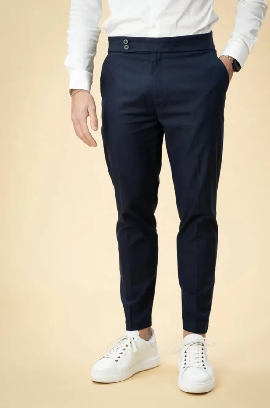 Com cintura média e cós estruturado, apresenta fecho frontal com dois botões e fecho de correr, além de bolsos laterais discretos e bolsos traseiros funcionais. O design minimalista e contemporâneo permite conjugar facilmente tanto em looks formais, com camisa e sapatos, como em combinações mais casuais, com t-shirt e ténis.