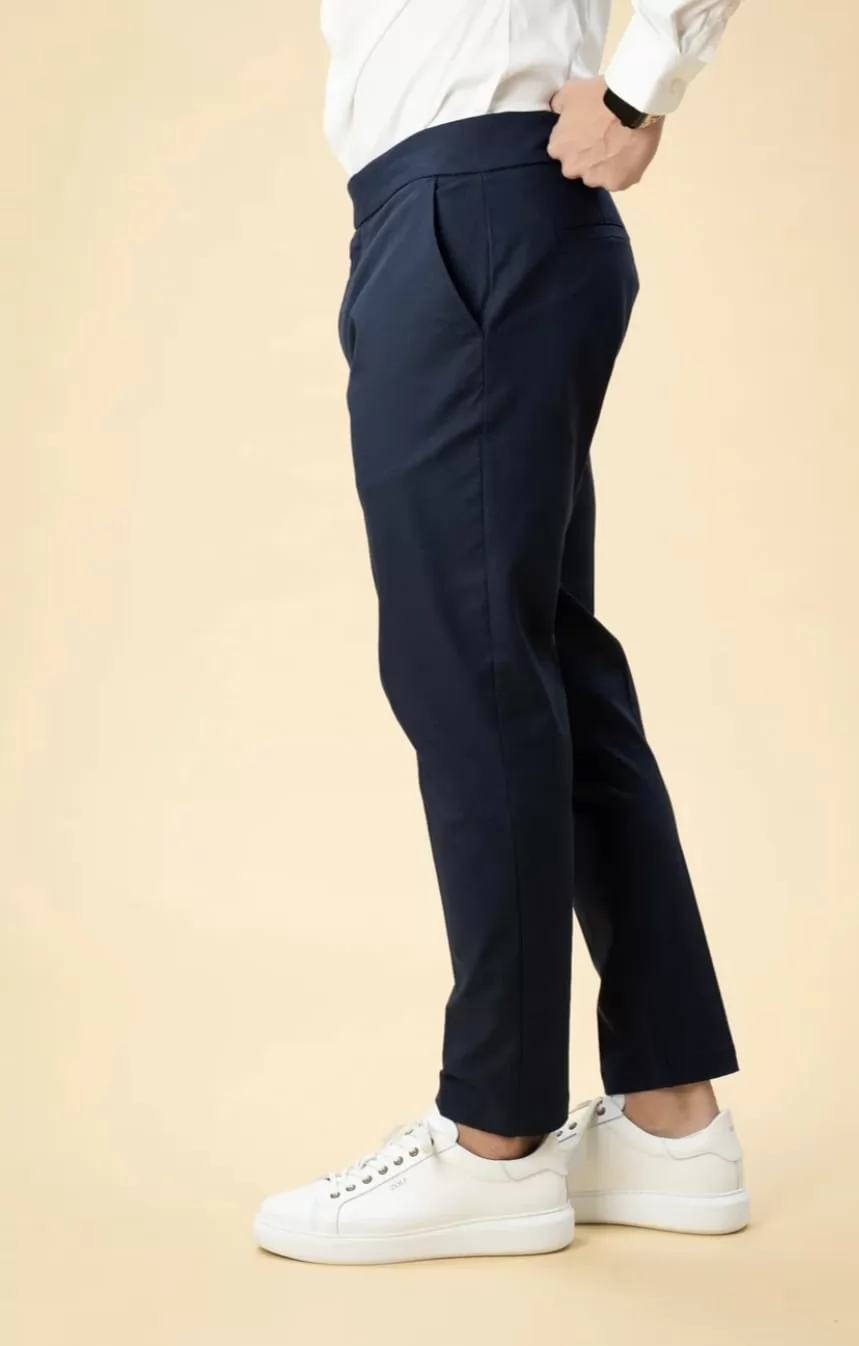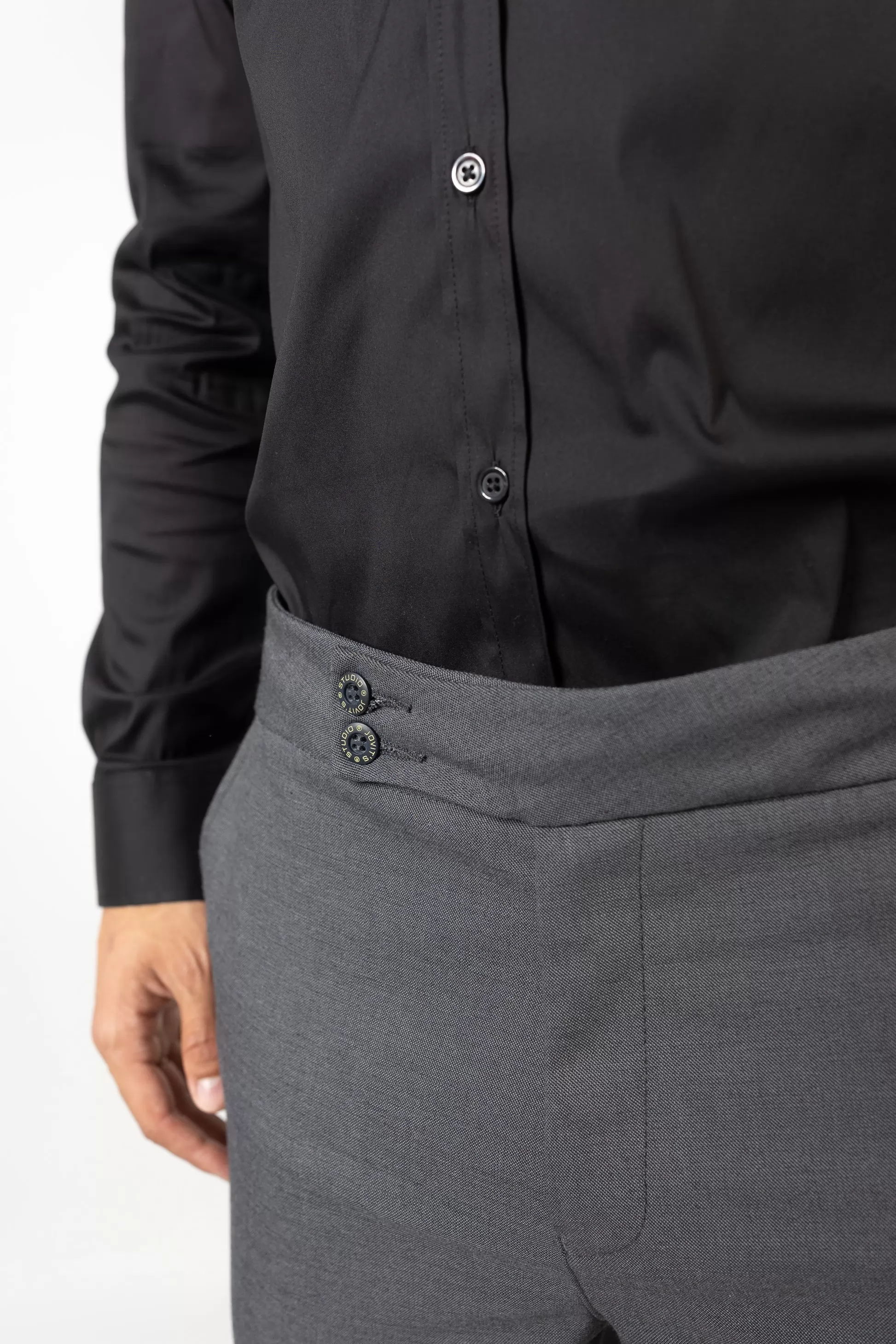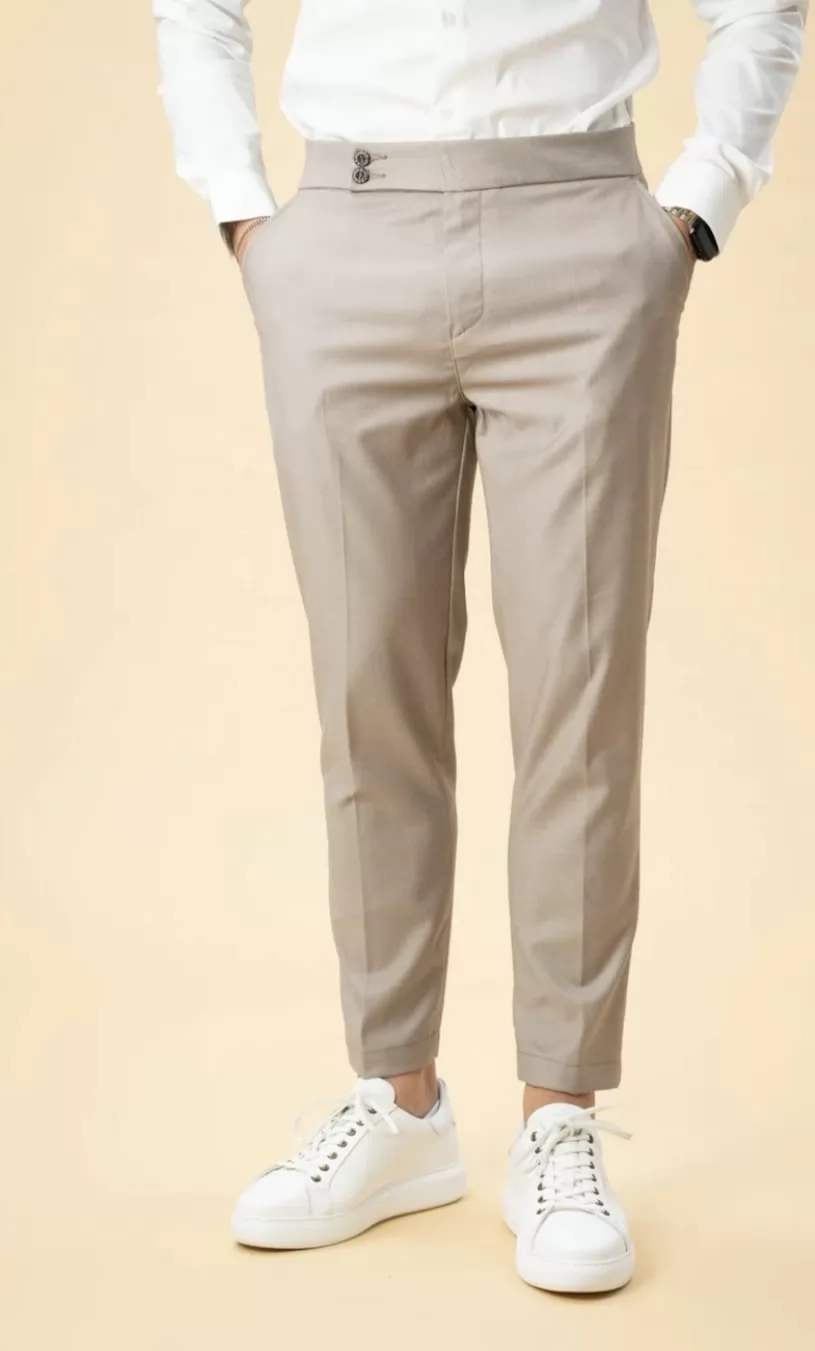 Com cintura média e cós estruturado, apresenta fecho frontal com dois botões e fecho de correr, além de bolsos laterais discretos e bolsos traseiros funcionais. O design minimalista e contemporâneo permite conjugar facilmente tanto em looks formais, com camisa e sapatos, como em combinações mais casuais, com t-shirt e ténis.
